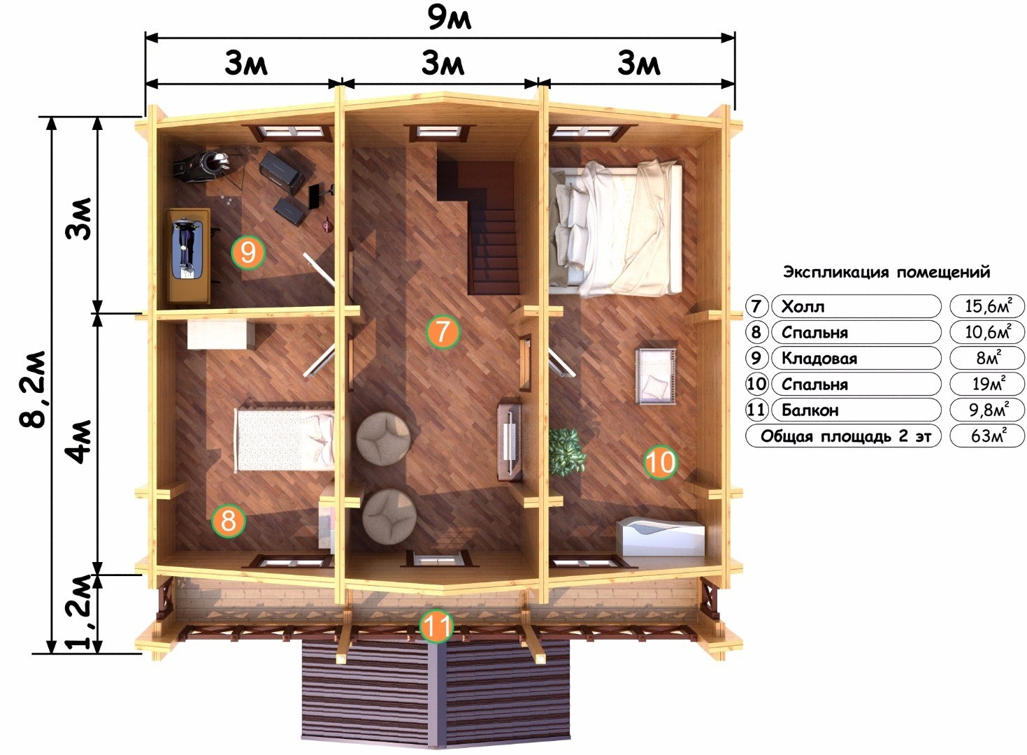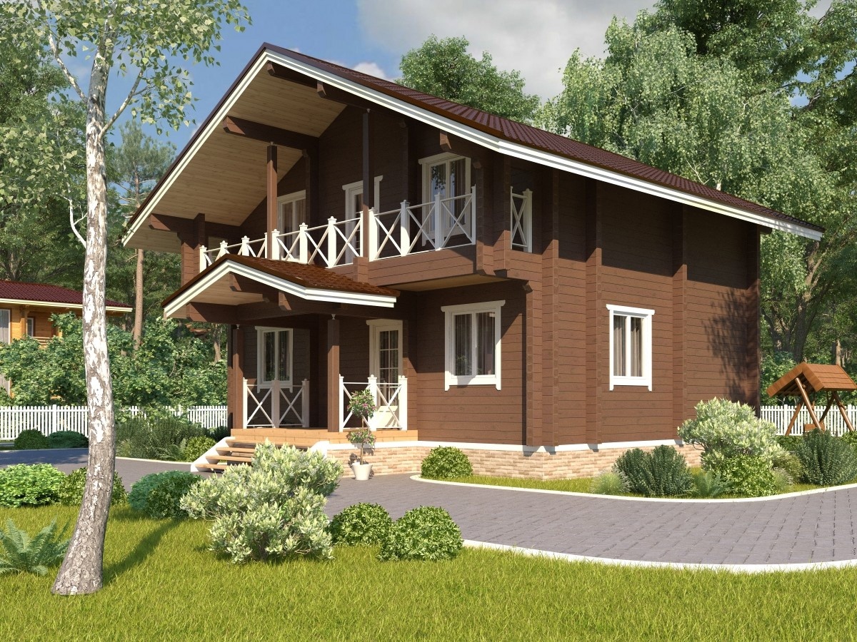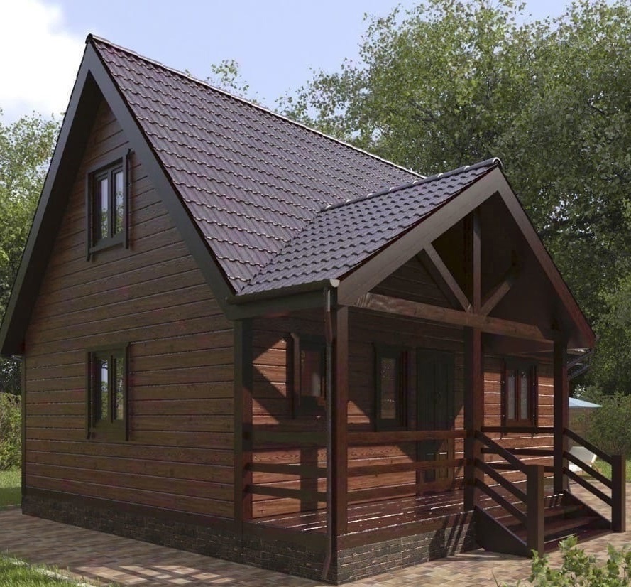 Дом 7х8м в полтора этажа с просторной террасой и балконом из профилированного бруса естественной влажности, сечением 150х150мм для сезонного проживания.